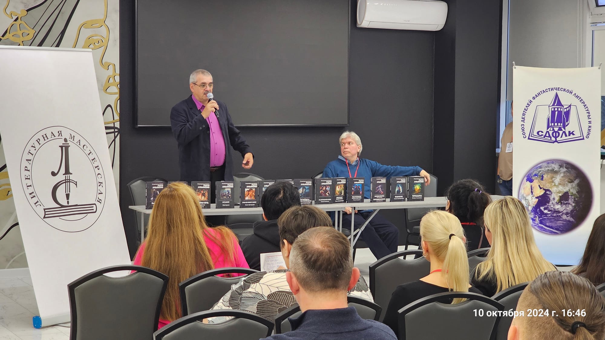 Ведущие: Вячеслав Бакулин, начальник отдела фантастики издательства «Эксмо», и Алекс Де-Клемешье, ведущий редактор группы "Жанры" издательства АСТ.